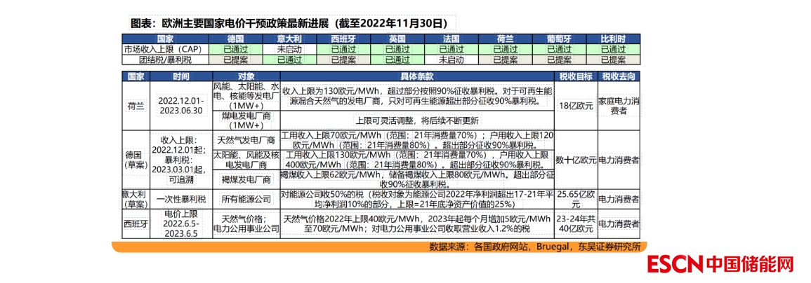 在歐洲邊際定價(jià)的模式下,電價(jià)大幅拉升,能源公司采購(gòu)新能源電力的成本遠(yuǎn)低于售電價(jià)格,因而獲得超額利潤(rùn)。在此背景下,歐洲推出兩項(xiàng)措施:1)180歐元市場(chǎng)收入上限(CAP):對(duì)可再生能源(太陽(yáng)能、風(fēng)能、水電等)發(fā)電公司,在2022年12月1日至2023年6月30日期間,市場(chǎng)收入設(shè)置了上限,為180歐元/MWh;2)暴利稅/團(tuán)結(jié)稅:對(duì)不可再生能源(石油、天然氣、煤炭等)發(fā)電公司,任何在2022-2023年實(shí)現(xiàn)的超額利潤(rùn)都將至少繳納33%的稅收。根據(jù)歐盟,團(tuán)結(jié)稅的收益應(yīng)流向能源消費(fèi)者、能源密集型公司等。