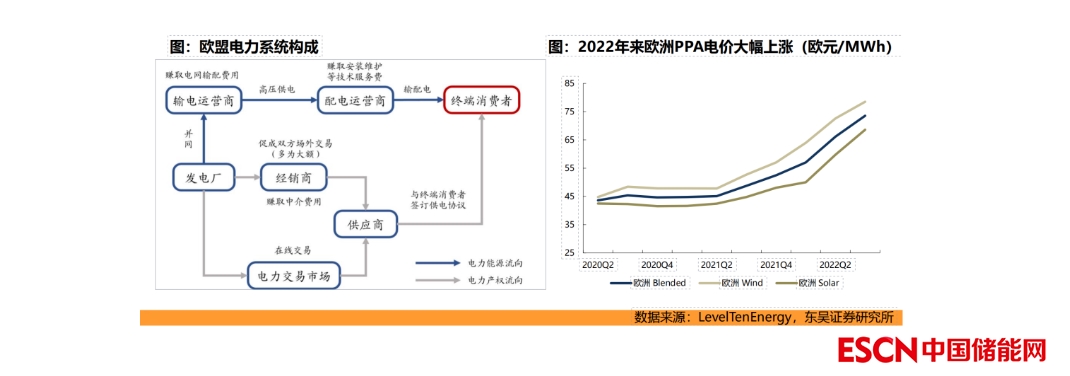 發(fā)電廠的電力一部分通過(guò)PPA電價(jià)售出。發(fā)電廠通過(guò)購(gòu)電協(xié)議(PPA) 鎖量鎖價(jià)的形式與下游能源供應(yīng)商簽署10-20年的電力供應(yīng)合約。2022年因歐洲能源緊缺、批發(fā)電價(jià)大幅上漲,PPA電價(jià)也呈現(xiàn)出上漲趨勢(shì),2022Q3平均光伏PPA電價(jià)為68.6歐元/MWh,同環(huán)增53.1%/14.7%,平均風(fēng)電PPA電價(jià)為73.5歐元/MWh,同環(huán)增50.9%/11.1%,能源危機(jī)下,電力發(fā)電廠收益顯著提升,加大新能源開(kāi)發(fā)力度。