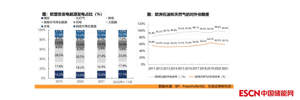 歐洲能源危機(jī)的根本原因是能源對(duì)外依賴度高,其根本解決方式是實(shí)現(xiàn)獨(dú)立能源。歐洲高度依賴于傳統(tǒng)化石能源,根據(jù)BP,2021年歐洲石油和天然氣對(duì)外依賴度為97%、60%,其中大部分能源來(lái)自俄羅斯。因此在俄烏沖突下,外部能源供給減少,直接導(dǎo)致歐洲能源緊缺,長(zhǎng)期看只有建立獨(dú)立能源才能保證歐洲能源供給穩(wěn)定,光伏風(fēng)電等新能源資源稟賦好、上量速度快,搭配儲(chǔ)能發(fā)展可逐步實(shí)現(xiàn)能源獨(dú)立。
