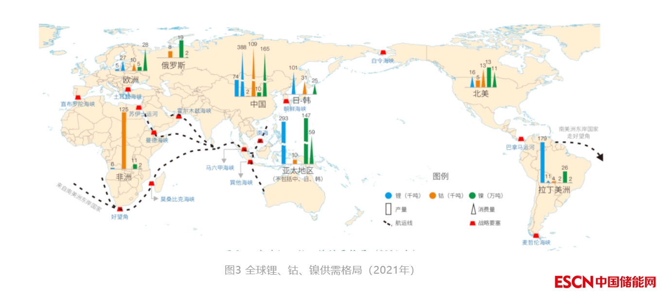 全球清潔能源資源生產(chǎn)與消費極不均衡。以鋰、鈷和鎳為例,歐盟、中國、日本、韓國和美國是全球重要消費國(地區(qū)),供應(yīng)則主要來自俄羅斯、非洲和拉丁美洲,空間上供應(yīng)和需求基本處于完全分離狀態(tài)(圖?3)。