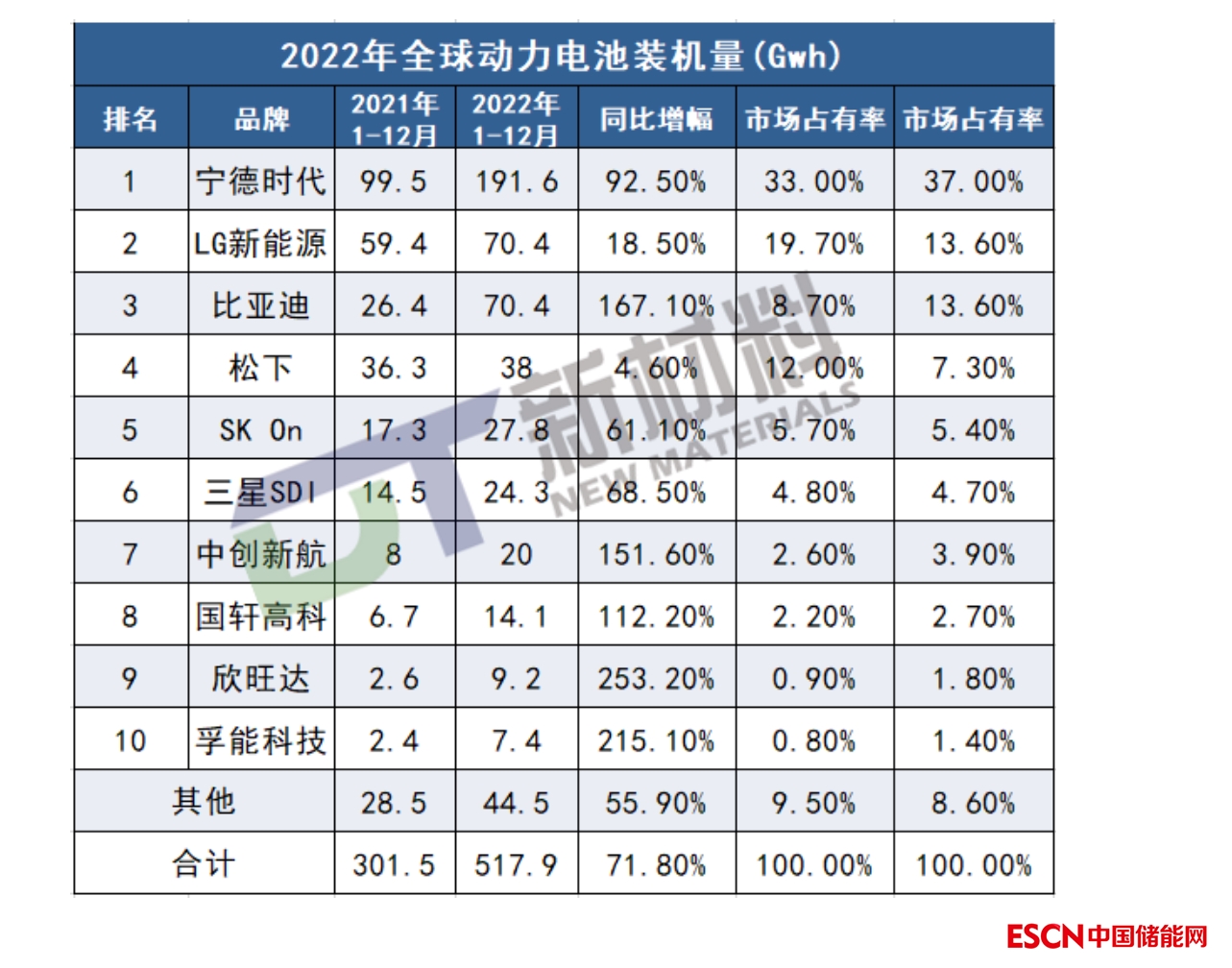 中國儲(chǔ)能網(wǎng)訊:2月7日,根據(jù)調(diào)研機(jī)構(gòu)SNE Research發(fā)布的最新數(shù)據(jù)顯示,2022年全球電動(dòng)汽車電池裝機(jī)量達(dá)到了517.9GWh,同比增長71.8%。