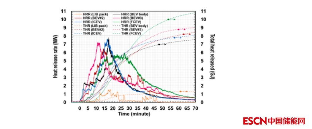 實(shí)驗(yàn)測(cè)試結(jié)果顯示六組實(shí)驗(yàn)對(duì)象整個(gè)火災(zāi)實(shí)驗(yàn)中峰值放熱功率依次分別為1.54 MW/7.81MW/ 6.51MW/ 7.25MW/ 7.66MW/ 5.99MW,總的放熱量依次分別為1.30GJ/ 7.53GJ/ 8.45GJ/9.03GJ/8.08GJ/10.82GJ。整個(gè)實(shí)驗(yàn)中車輛直到完全燒毀至少持續(xù)了70分鐘。在發(fā)生火災(zāi)約1-2分鐘,觀察到實(shí)驗(yàn)組2、實(shí)驗(yàn)組3和傳統(tǒng)燃油汽車的放熱功率迅速增加,導(dǎo)致這三組實(shí)驗(yàn)不同主要是由于火災(zāi)誘發(fā)工具在誘發(fā)火災(zāi)過程中釋放大量的熱所導(dǎo)致而并非試樣樣品的燃燒所導(dǎo)致。實(shí)驗(yàn)組從火災(zāi)發(fā)生約11–17分鐘后達(dá)到峰值放熱功率。實(shí)驗(yàn)過程中除FCEV外,其它實(shí)驗(yàn)組在達(dá)到峰值放熱功率后放熱功率迅速進(jìn)入衰減階段,相比FCEV在峰值放熱功率持續(xù)更長時(shí)間。對(duì)比總放熱量,實(shí)驗(yàn)組4總的放熱量(9.03GJ)與實(shí)驗(yàn)組1/實(shí)驗(yàn)組2放熱量的和(8.83GJ)相當(dāng),其中電池包釋放總熱量為1.30GJ,不含電電池組汽車車身火災(zāi)釋放的熱量為7.53GJ,可以認(rèn)為整個(gè)BEV發(fā)生火災(zāi)后熱量釋放與車身有其它部位可燃物的量有很大關(guān)聯(lián)性。同時(shí)對(duì)比發(fā)現(xiàn)BEV(含64kWh電池包)火災(zāi)總熱量大于傳統(tǒng)燃油車釋放的總熱量,小于氫燃料電池汽車總的熱量釋放,也與車重量有關(guān),進(jìn)一步分析火災(zāi)總熱量與汽車內(nèi)部可燃物重量息息相關(guān)。