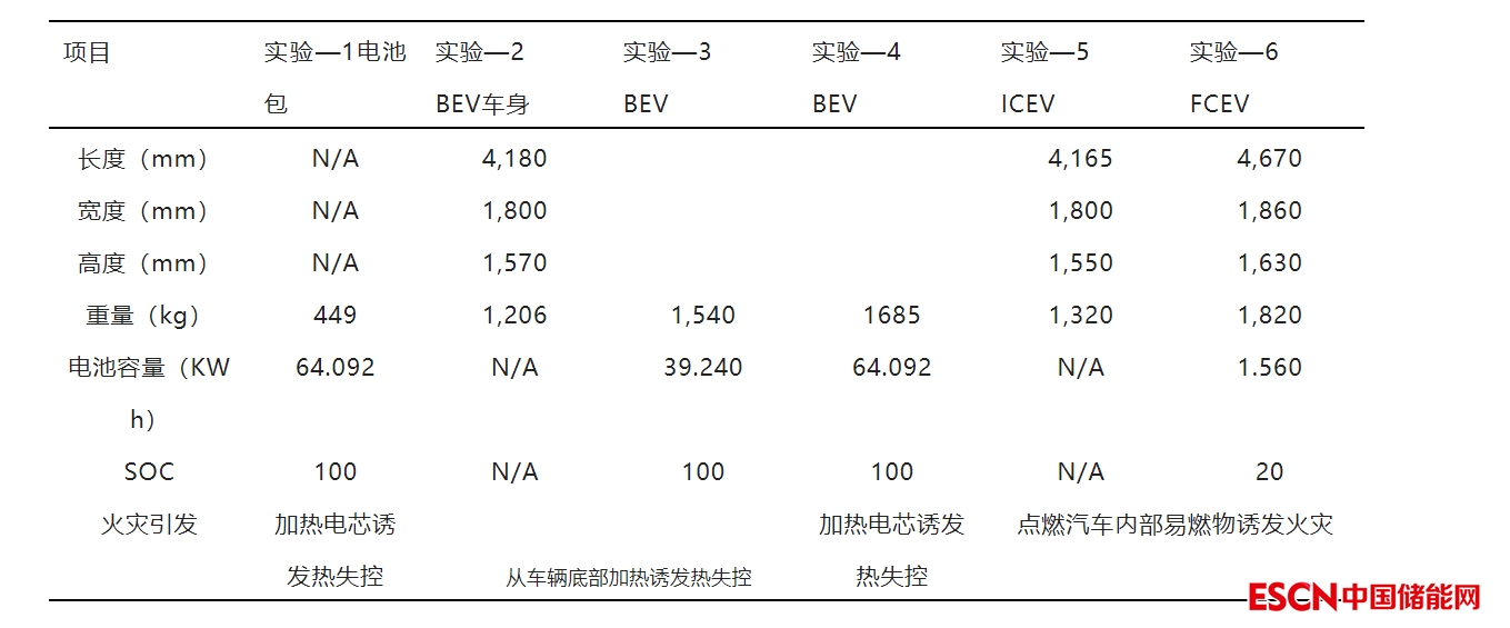 本次實(shí)驗(yàn)共設(shè)計(jì)了六組實(shí)驗(yàn),實(shí)驗(yàn)對(duì)象及誘發(fā)火災(zāi)具體條件如下表所示,為了使實(shí)驗(yàn)數(shù)據(jù)更具說服力,分別針對(duì)不含電池組的BEV、電池組、以及含有電池組的BEV進(jìn)行了火災(zāi)實(shí)驗(yàn)。作為對(duì)比同時(shí)還選擇了傳統(tǒng)燃油車和氫燃料電池汽車作為對(duì)照組進(jìn)行了對(duì)比實(shí)驗(yàn)。其中BEV選著了兩款汽車,一款帶電量為39KWh(短續(xù)航),一款為64KWh(長續(xù)航),燃料電池汽車中電池組帶電量較小約1.5KWh,其中電荷狀態(tài)為20%SOC。BEV所采用的電芯為NCM622軟包電池,電池標(biāo)準(zhǔn)容量為60Ah,能量密度為245Wh/kg。