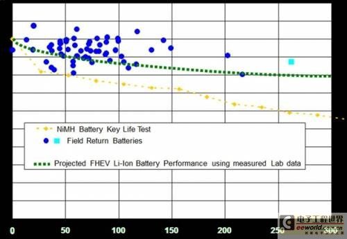 根據(jù)福特的調(diào)查,購買混合動力車潛在用戶對鋰電池可靠性的要求超過了其他17項因素,而“關(guān)鍵壽命試驗”致力于此。福特電動工程師Kevin Layton說:“在我們的測試中,鎳氫電池(福特翼虎混動車中取出的,有一部分已使用了25萬英里)的表現(xiàn)近乎完美。”在2004年推出的翼虎混動曾在 加州組成混動出租車隊,總計已行駛了一億英里。福特之前已銷售了5000萬個電池芯(cell),只有六個出現(xiàn)故障。這樣的低故障率也如實地在這個KLT 試驗中得到了展現(xiàn)。因此,針對該試驗結(jié)果,福特電動工程師Kevin Layton說:“我們對鋰鐵電池性能超越鎳氫電池性能很有信心。”測試結(jié)果如下圖表,鋰鐵電池的衰減速度比鎳氫電池還要慢20%。