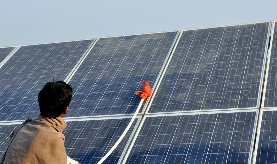 保持供電:太陽(yáng)埃迪森公司已聘請(qǐng)村民照看電廠。印度太陽(yáng)能發(fā)電的一個(gè)挑戰(zhàn)是,多塵環(huán)境會(huì)大大減少發(fā)電量,如果電池板不能保持清潔的話就是這樣。