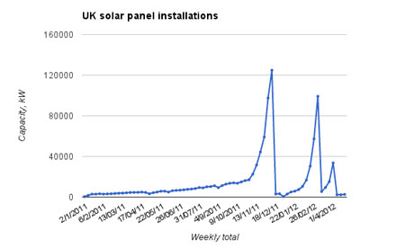 從4月1日起,太陽能發(fā)電的補貼從每度電0.43英鎊逐漸縮減至0.21英鎊。而此后的三個星期,平均每周的太陽能發(fā)電裝機容量只有2.4兆瓦,相比于去年每周平均的18兆瓦下降了87%。(1英鎊約合10.22元人民幣)
