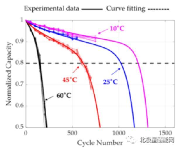 圖:電池的容量與溫度和循環(huán)次數(shù)的關系