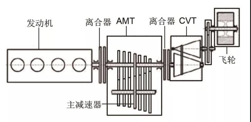 2012年博洛尼亞大學研制了一種搭載AMT的飛輪混合動力系統(tǒng),如圖17所示。該系統(tǒng)中飛輪通過CVT及離合器與自動變速器輸入軸相連,可實現(xiàn)制動能量回收和發(fā)動機負載點切換。