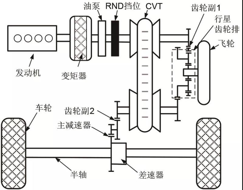 機械式飛輪混合動力系統(tǒng)由于不需要電機/發(fā)電機、電力電子設(shè)備等部件,具有結(jié)構(gòu)簡單、緊湊及質(zhì)量輕的特點。汽車減速時,車輛傳動系統(tǒng)具有的動能直接以機械能的形式儲存于飛輪中;加速或爬坡狀態(tài)下,旋轉(zhuǎn)的飛輪作為輔助動力源經(jīng)離合器(或CVT)與傳動系統(tǒng)動力耦合,為發(fā)動機提供瞬時大功率補償。由于飛輪與傳動系統(tǒng)間的能量轉(zhuǎn)換形式并未發(fā)生改變,故其能量傳遞效率優(yōu)于電驅(qū)動式。機械式飛輪混合動力系統(tǒng)的典型結(jié)構(gòu)如圖9所示。