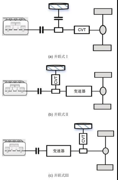 圖9(a)并聯(lián)式Ⅰ中發(fā)動機與飛輪通過離合器與動力耦合器耦合或解耦,低負荷時發(fā)動機可以運行在經(jīng)濟區(qū)域內(nèi),并同時為飛輪充電;大負荷時,飛輪可為發(fā)動機提供額外的后備功率。該結(jié)構(gòu)形式缺點是飛輪的轉(zhuǎn)速不可調(diào),且動力耦合輸出時控制策略相對復雜。并聯(lián)式Ⅱ中發(fā)動機功率點可通過CVT調(diào)節(jié),發(fā)動機運行在經(jīng)濟區(qū)域內(nèi),且飛輪轉(zhuǎn)速可調(diào),但CVT的存在會降低能量轉(zhuǎn)換效率。并聯(lián)式Ⅲ中飛輪及CVT置于變速器后方,便于與現(xiàn)有的傳動系統(tǒng)集成及實現(xiàn)制動能量回收,但發(fā)動機功率點不易調(diào)節(jié)。