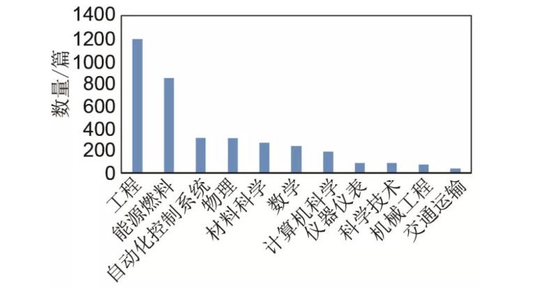 圖5表明,自2000年后關(guān)于飛輪儲能技術(shù)的文獻發(fā)表量呈線性增加趨勢,且2018年達到124篇,這與EI數(shù)據(jù)庫的統(tǒng)計趨勢一致。將1316條按研究方向精煉檢索后得到圖6,其中工程方向論文檢索量為1194條,其次是能量燃料845條,自動化控制系統(tǒng)311條,機械工程文獻檢索量為74條,交通運輸方向39條。上述檢索數(shù)據(jù)表明汽車用飛輪儲能技術(shù)方向的文獻發(fā)表量同中國知網(wǎng)(CNKI)及EI數(shù)據(jù)庫的文獻發(fā)表數(shù)量基本一致,即國內(nèi)外發(fā)展趨勢一致。