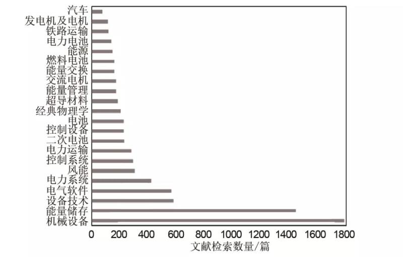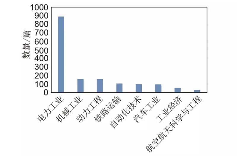 在中國知網(wǎng)(CNKI)數(shù)據(jù)庫中以“飛輪儲能”為主題搜索到文獻共2028條,其中期刊文獻1415條。飛輪儲能研究多集中于電力工業(yè),文獻總量有889條,其次是機械工業(yè)(183條)、動力工程(174條)、鐵路運輸(102條)、自動化技術(shù)(99條),而汽車工業(yè)關(guān)于飛輪儲能的研究僅有97條,如圖2所示。