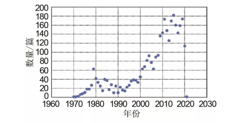 以“All fields”中包含“flywheel energy storage”為檢索手段,共檢索到3180條記錄(1970—2021年),各年份論文發(fā)表數(shù)量如圖3所示。2000年之前,關(guān)于飛輪儲能的文獻年發(fā)表量低于50篇,2000年以后發(fā)表的文獻量快速增加。