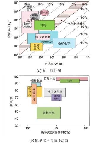 拉貢特性圖可以對儲能裝置比功率和比能量進行初始評估,并依照比能量與比功率的比值定義放電時間,即圖1(a)中的虛對角線,每條虛對角線上的充放電持續(xù)時間相等,通過充放電持續(xù)時間的識別確定所選擇的儲能裝置是否能夠以最小質(zhì)量滿足能量或功率需求。此外,能量效率和預期循環(huán)次數(shù)也可以評估儲能裝置的儲能特性,如圖1(b)所示,放電深度為80%時,超級電容和飛輪的能量效率可達到95%,循環(huán)次數(shù)超過10000次,電池的能量效率約為60%~90%,循環(huán)次數(shù)為1000~4000次,燃料電池能量效率低,但循環(huán)次數(shù)相對較長。目前,動力電池和超級電容作為汽車用的主流儲能裝置,可滿足車輛不同工況下的能量需求,但無法同時兼顧比功率和比能量要求;而飛輪能夠以相對較高的比能量和比功率滿足上述需求,且循環(huán)壽命和能量效率較高。