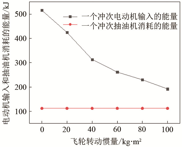 圖12所示為安裝不同轉(zhuǎn)動(dòng)慣量的飛輪時(shí),一個(gè)沖次內(nèi)電動(dòng)機(jī)的輸入能量和抽油機(jī)消耗的能量變化曲線。抽油機(jī)消耗的能量值等于懸點(diǎn)載荷做功的絕對(duì)值,對(duì)電動(dòng)機(jī)的電功率曲線求積分可得電動(dòng)機(jī)的輸入能量。由圖12可知,在抽油機(jī)負(fù)載不變的條件下,一個(gè)沖次內(nèi)電動(dòng)機(jī)的輸入能量隨安裝飛輪轉(zhuǎn)動(dòng)慣量的增大而減小。