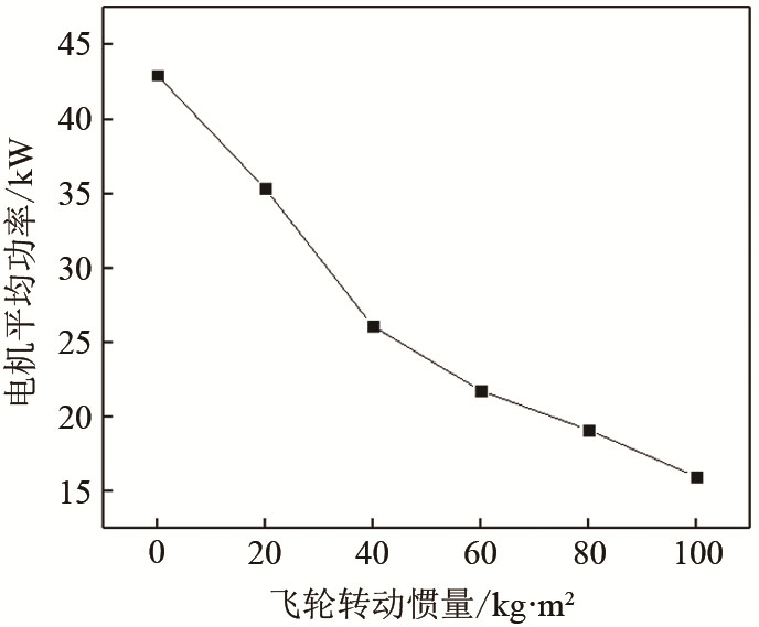 對(duì)電機(jī)功率曲線求積分,可以計(jì)算出安裝不同轉(zhuǎn)動(dòng)慣量飛輪時(shí)的平均功率如圖11所示,結(jié)果表明:飛輪轉(zhuǎn)動(dòng)慣量越大,電機(jī)的平均功率越小,未安裝飛輪時(shí)平均功率為42.96 kW,當(dāng)安裝轉(zhuǎn)動(dòng)慣量為100 kg·m2的飛輪時(shí),平均功率僅為16 kW,節(jié)能效果明顯。所以,在游梁式抽油機(jī)中安裝飛輪可以降低電機(jī)的平均功率,且隨著轉(zhuǎn)動(dòng)慣量增大電機(jī)平均功率變小。