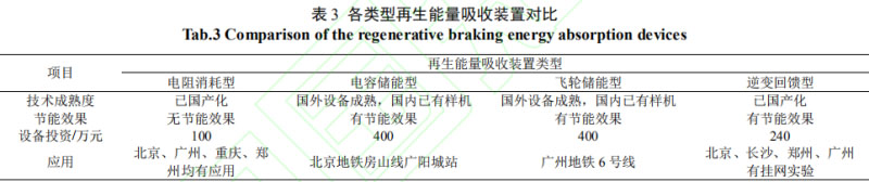地鐵能量回收是一種大功率、高頻次的應(yīng)用場景,目前應(yīng)用較為廣泛的是再生制動能量吸收利用。當(dāng)制動能量不能被本車吸收時,牽引網(wǎng)電壓上升,上升到一定程度后,牽引變電所中再生制動能量吸收裝置投入工作,吸收再生電流,使車輛再生電流穩(wěn)定,如圖 3 所示。目前,再生能量吸收裝置可分為電阻消耗型、電容儲能型、飛輪儲能型、逆變回饋型,各類型裝置對比如表 3 所示。目前電容儲能型和飛輪儲能型較為常用。