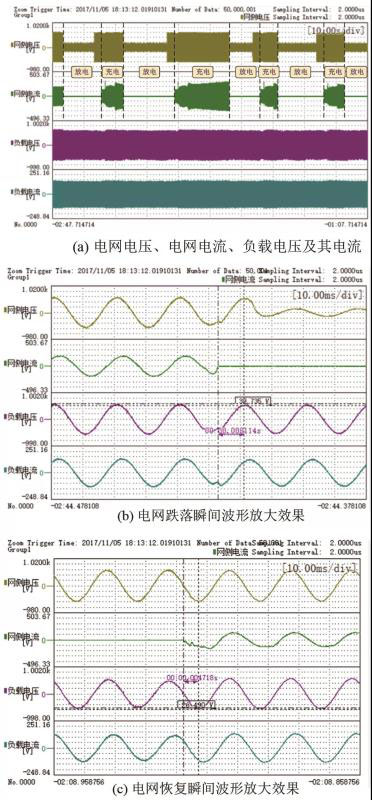在UPS充滿電后,頻繁手動拉閘與合閘電網(wǎng),以檢驗UPS應對電網(wǎng)連續(xù)故障的性能。實驗中設定UPS充電功率為85 kW,負載功率為50 kW,每次電網(wǎng)恢復到額定值后,經(jīng)過2.5 s飛輪開始充電。實驗結果如圖11所示。由于控制柜轉換開關處有漏壓,導致圖11(a)中網(wǎng)側電壓拉閘后電壓不為0。