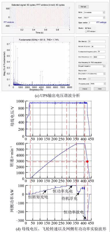 從圖11(a)看出,UPS能夠及時應對電網(wǎng)頻繁故障,負載電壓基本不受電網(wǎng)斷電影響。由于負載功率降低至50 kW,負載電壓恢復時間縮短至8 ms。以上結果表明UPS具有良好的快速響應性能,進一步證明了準PR方法的有效性以及飛輪充放電控制策略的有效性。