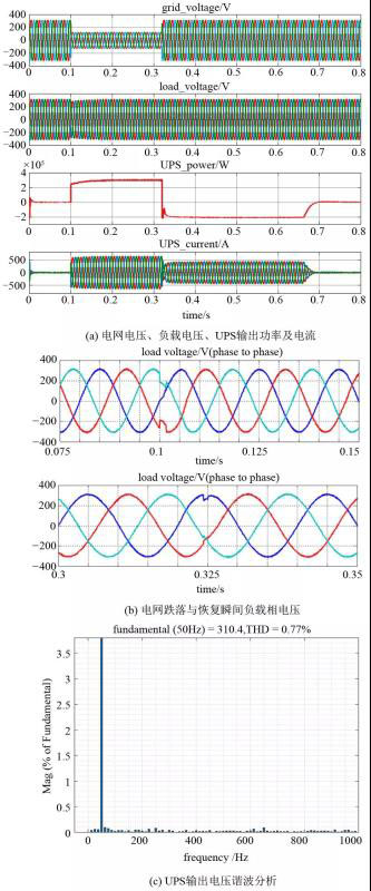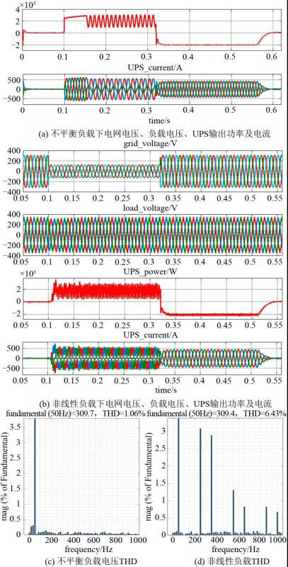 圖9(b)和(d)為非線性負載下的仿真結果,負載為三相不控整流電路,其直流側接1.46 Ω電阻。從結果可以看出,UPS輸出功率和電流波動頻率高且不正弦,這是由負載非線性造成的;負載電壓在電網(wǎng)供電與UPS供電兩種情況下波形基本沒有差別,UPS輸出電壓波形THD為6.43%,諧波主要集中在基頻的5次和7次,這說明UPS具有良好的帶非線性負載能力。