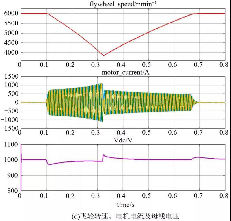 仿真過程中,飛輪工作在設定轉速范圍內,并以恒功率的方式進行充電和放電;電機電流正弦且光滑,諧波較小;母線電壓保持穩(wěn)定,最大波動幅值小于3%。這驗證了充放電控制方法的有效性。