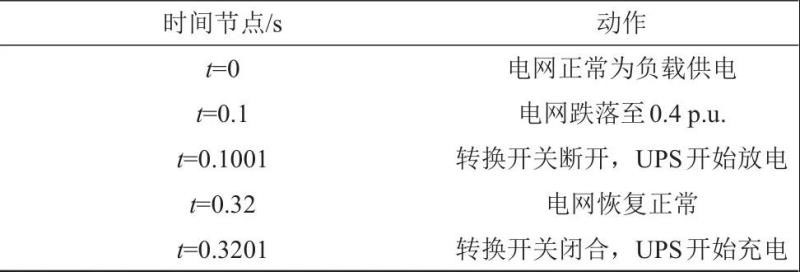 利用Simulink搭建后備式飛輪儲能UPS系統(tǒng)模型,電網(wǎng)電壓跌落后,UPS分別為線性平衡負載、線性不平衡負載以及非線性負載供電,以驗證UPS快速響應能力以及帶載能力。仿真中,準PR控制采用上一節(jié)中設計的參數(shù),電網(wǎng)和負載參數(shù)如表1所示,仿真流程如表2所示。