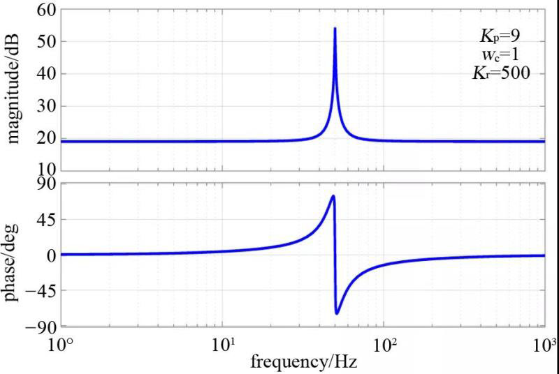 式中,Kp為比例增益;ωc為控制器帶寬;Kr為諧振頻率處增益;ω0為諧振頻率,此處為50 Hz。為使準PR控制器發(fā)揮良好的跟蹤性能,需要合理調節(jié)前三個參數(shù):Kp用以提高快速性能,在斷電瞬間迅速做出反應;ωc用以限制頻率調節(jié)范圍,此處設置為40~50 Hz;Kr用以提高快速性能以及穩(wěn)態(tài)性能,其越大穩(wěn)態(tài)誤差越小,但同時穩(wěn)定性變差。本文針對輸出工頻電壓控制,設計準PR控制器參數(shù)分別為:Kp=9,ωc=1,Kr=500,傳遞函數(shù)的波特圖如圖7所示。從幅頻特性看,在40~60 Hz頻域內,系統(tǒng)增益較大,在50 Hz處達到極點,在此頻域范圍外,增益比較小,這有利于減小穩(wěn)態(tài)誤差和提高抗干擾能力。