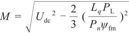 本文采用空間矢量調制方法,變流器輸出線電壓幅值最大為母線電壓Udc。因此可建立方程