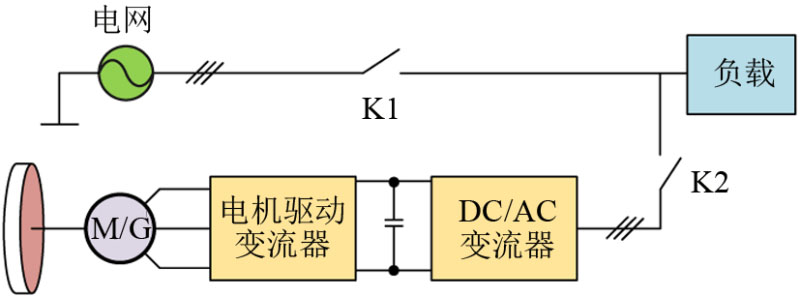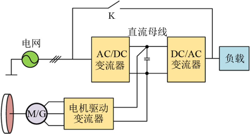 文獻[3]系統(tǒng)地梳理了蓄電池UPS的拓撲分類,即在線雙變換式、在線交互式和后備式三種,并分析了各拓撲的運行機制以及動態(tài)性能。閥控式蓄電池具有能量密度大、技術成熟等優(yōu)點,目前在UPS系統(tǒng)中應用最為普遍,但是其缺點在于充電時間長、平均無故障時間短、環(huán)境不友好等,而且使用壽命為僅5年左右。飛輪儲能技術是一種清潔環(huán)保技術,借助于磁懸浮技術和電力電子技術的發(fā)展,飛輪儲能單元具有效率高、維護成本低、可頻繁充放電等優(yōu)勢,而且使用壽命可達20年,可較為理想地替換蓄電池。近幾年國外的Vycon、Active Power、盾石磁能科技有限責任公司等公司開發(fā)的飛輪儲能UPS已成功應用于軌道交通和微電網(wǎng)等領域,國內的高校和公司在飛輪儲能領域也做了很多研究。然而,大部分的產(chǎn)品和研究主要集中于在線式拓撲,如Vycon公司VDC系列產(chǎn)品和文獻采用背靠背變流器為負載供電,飛輪控制器的直流側與背靠背變流器的直流母線連接,這種拓撲供電質量比較高,而可靠性和效率相對較低;Active Power公司開發(fā)的CLEAN SOURCE系列產(chǎn)品采用并聯(lián)在線式拓撲,提高了可靠性和效率,但是結構相對復雜。