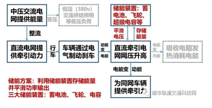 事實上,目前使用的儲能技術(shù)方案,比起單純地把站臺修高則要復(fù)雜和有效得多,為地鐵系統(tǒng)節(jié)能降耗提供了更多的調(diào)度和使用的靈活性,其能量流轉(zhuǎn)過程如下圖所示,儲能的代表技術(shù)主要有蓄電池儲能、電容儲能、飛輪儲能3種。