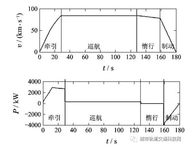 如上圖所示,車輛在站間運行時,先經(jīng)歷牽引階段,車輛由靜止開始加速,電機消耗較大的功率產(chǎn)生牽引力,車速加速至80km/h左右。之后,車輛進入等速巡航階段,此時電網(wǎng)只需要提供較小的功率即可維持車輛的巡航,車輛快到站的時候,電網(wǎng)不再提供功率,車輛開始惰行,車速稍有降低,最后車輛進入制動階段,車速迅速減至0。