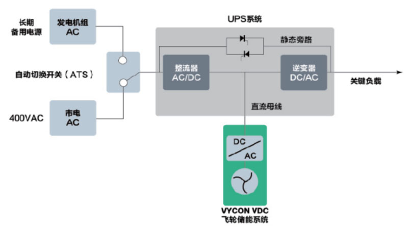 VYCON公司的VDC系列飛輪儲(chǔ)能設(shè)備利用飛輪高速旋轉(zhuǎn)的動(dòng)能來存儲(chǔ)能量并提供可靠的直流電源。飛輪儲(chǔ)能設(shè)備通過UPS的直流總線接入,其接入方式與傳統(tǒng)鉛酸蓄電池完全相同。充電時(shí),飛輪儲(chǔ)能設(shè)備從UPS接收充電電流,維持最高工作轉(zhuǎn)速;當(dāng)UPS輸入電源故障時(shí),飛輪儲(chǔ)能設(shè)備通過UPS逆變器快速放電,向負(fù)載提供不間斷電源保障。