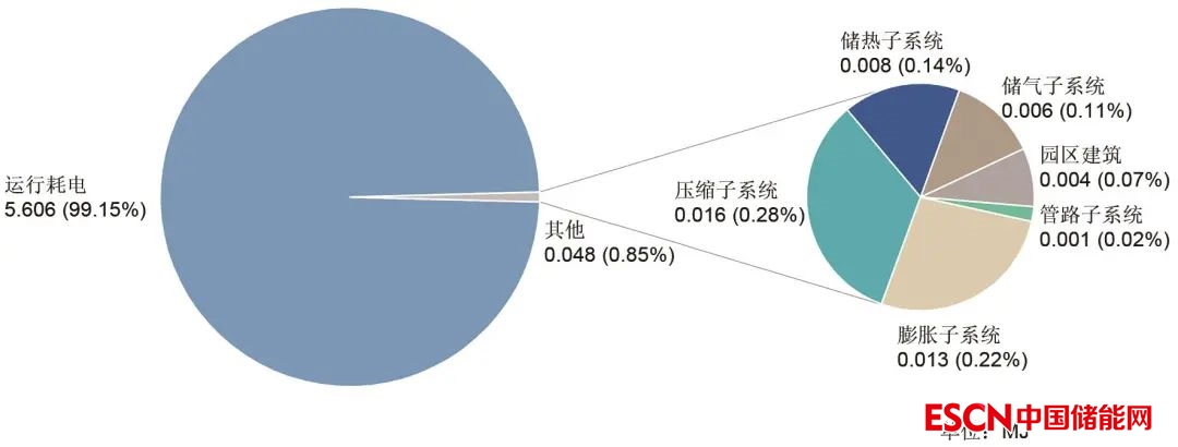 10 MW先進CAES系統(tǒng)每發(fā)電1 kWh需要消耗能量為5.653 MJ,由此可通過計算得到該系統(tǒng)的全生命周期凈能量效率為63.68%。其中,運行階段輸入的儲能電量5.606 MJ,占總耗能的99.16%;其余部分為系統(tǒng)在生產、建造和廢棄階段的耗能,總計0.047 MJ,占0.83%。除運行階段的耗能外,將系統(tǒng)其他階段的耗能按不同子系統(tǒng)進行劃分,結果如圖5所示。其中,壓縮子系統(tǒng)和膨脹子系統(tǒng)的耗能是最多的,分別為0.016 MJ和0.013 MJ,分別占總耗能的0.29%和0.22%;儲熱子系統(tǒng)和儲氣子系統(tǒng)的耗能分別為0.008 MJ和0.006 MJ,占總耗能的0.14%和0.10%;管路系統(tǒng)及園區(qū)建設部分的耗能在總能耗中占比較小,總計0.08%。