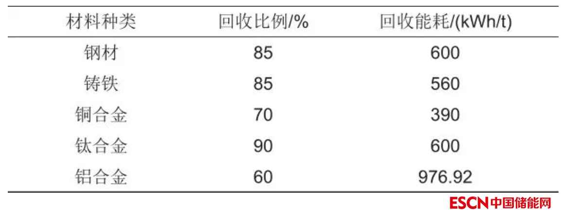 廢棄處置階段主要涵蓋儲能系統(tǒng)報廢后的拆除過程及拆除后設備和材料的處置,如原材料的再利用、焚燒、填埋等。參照火力發(fā)電廠及普通建筑,拆除階段能耗取建造階段的30%,不同材料的回收比例及回收耗能如表5所示,其余材料均以填埋方式處理。