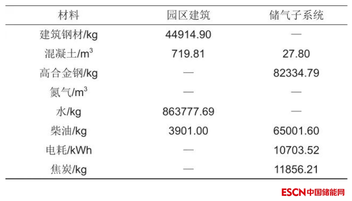 建造階段主要涵蓋原材料及部件的運輸、園區(qū)和廠房的建設、儲氣鹽穴的建造及系統(tǒng)安裝建設。園區(qū)建筑包括主廠房、輔房和水泵房等,園區(qū)建筑清單包括各建筑物的建筑面積、樓層、占地面積、建筑類型及建筑物建造過程所使用的建筑材料。本系統(tǒng)采用廢棄鹽穴作為儲氣裝置,儲氣鹽穴的建造清單包括采注井筒的建造耗能及耗材,參考10 MW先進CAES示范電站建設中廢舊鹽穴的改造過程,采注井筒采用G55鋼。10 MW系統(tǒng) 建造階段所需材料和耗能參數(shù)如表3所示。
