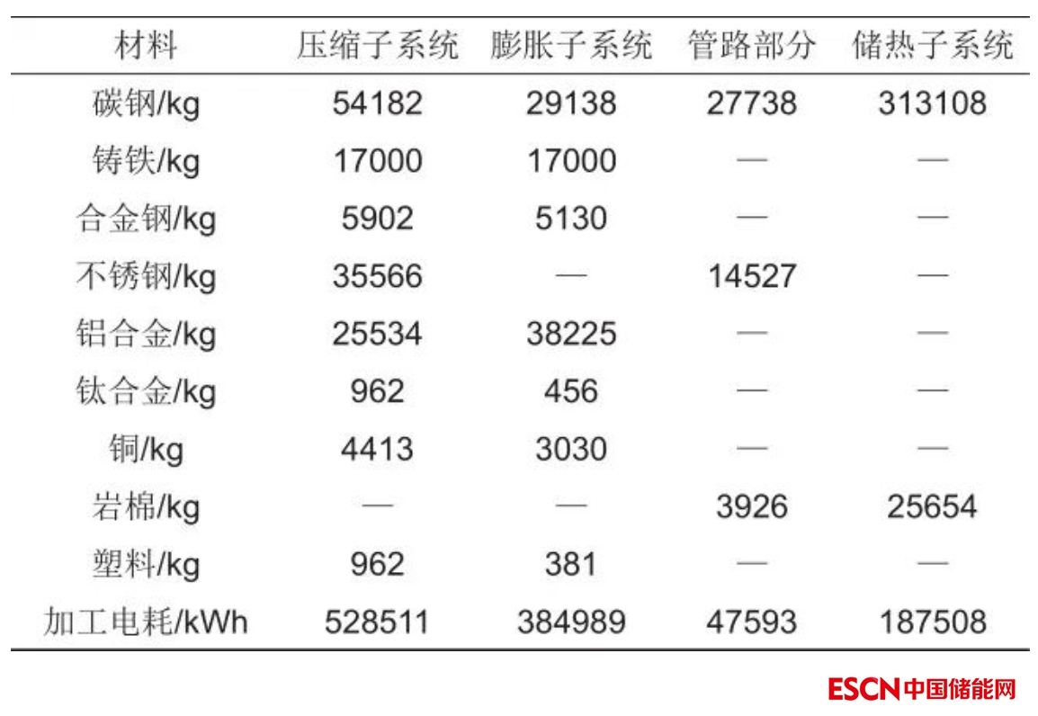 生產階段主要涵蓋范圍為10 MW先進CAES系統(tǒng)所需壓縮子系統(tǒng)、膨脹子系統(tǒng)、儲熱子系統(tǒng)及管路中各種部件、閥門、管道等的原材料獲取、運輸、生產和加工等過程。儲氣部分采用的是鹽穴儲氣,因此這一部分放在建造階段討論?;趯δ?0 MW先進CAES示范電站、相關文獻和數(shù)據(jù)庫的調研分析,本研究獲取了10 MW先進CAES系統(tǒng)的主要組成部分的耗材及耗能,具體如表2所示。