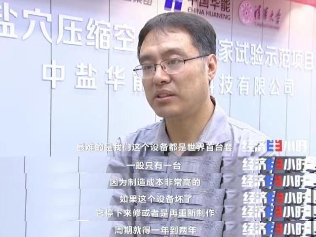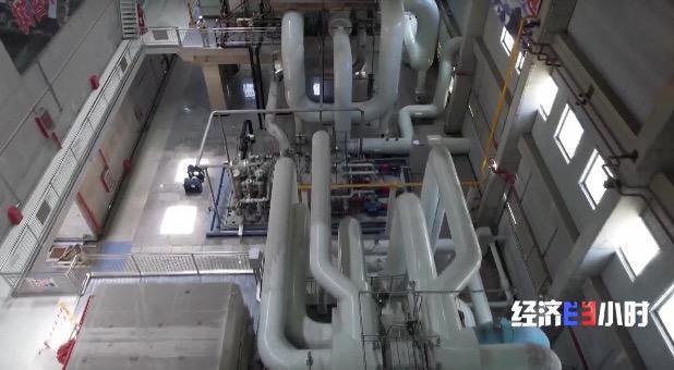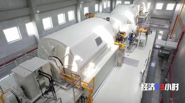 這臺(tái)空氣壓縮機(jī)的原理有點(diǎn)像我們給輪胎充氣的“打氣筒”,它的作用是將空氣從大氣環(huán)境下的1個(gè)大氣壓,壓縮至140個(gè)大氣壓,并送到地下鹽穴。產(chǎn)生的熱能儲(chǔ)存在導(dǎo)熱油罐中,持續(xù)8個(gè)小時(shí),電站就完成了一個(gè)儲(chǔ)能周期。