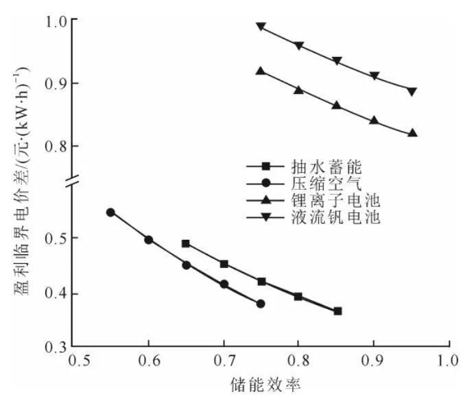 (儲能效率對盈利臨界電價差的影響)