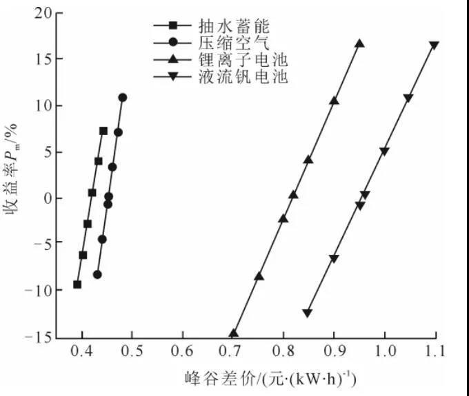 (不同峰谷電價差下各儲能系統(tǒng)的收益率)