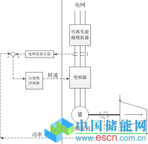 可再生能源模擬系統(tǒng)研究主要針對(duì)壓縮空氣儲(chǔ)能控制系統(tǒng)的試驗(yàn)和測(cè)試,依據(jù)可再生能源電站的電力輸出特性,建立了一套合理的電能模擬和運(yùn)行控制制度,使儲(chǔ)能系統(tǒng)能夠高效發(fā)揮自身的儲(chǔ)能功用,最大限度地提高聯(lián)合運(yùn)行的經(jīng)濟(jì)、技術(shù)效益。其原理如下圖所示,即利用模擬系統(tǒng)在實(shí)驗(yàn)室再現(xiàn)電壓/頻率波動(dòng)、電力間歇供電等典型可再生能源電網(wǎng)真實(shí)運(yùn)行環(huán)境,為儲(chǔ)能系統(tǒng)提供電能。同時(shí)根據(jù)電網(wǎng)負(fù)荷和壓縮機(jī)部件功率差分計(jì)算結(jié)果,利用壓縮機(jī)控制器和變頻器實(shí)時(shí)控制壓縮機(jī)負(fù)荷,實(shí)現(xiàn)對(duì)不穩(wěn)定電能的存儲(chǔ)利用。