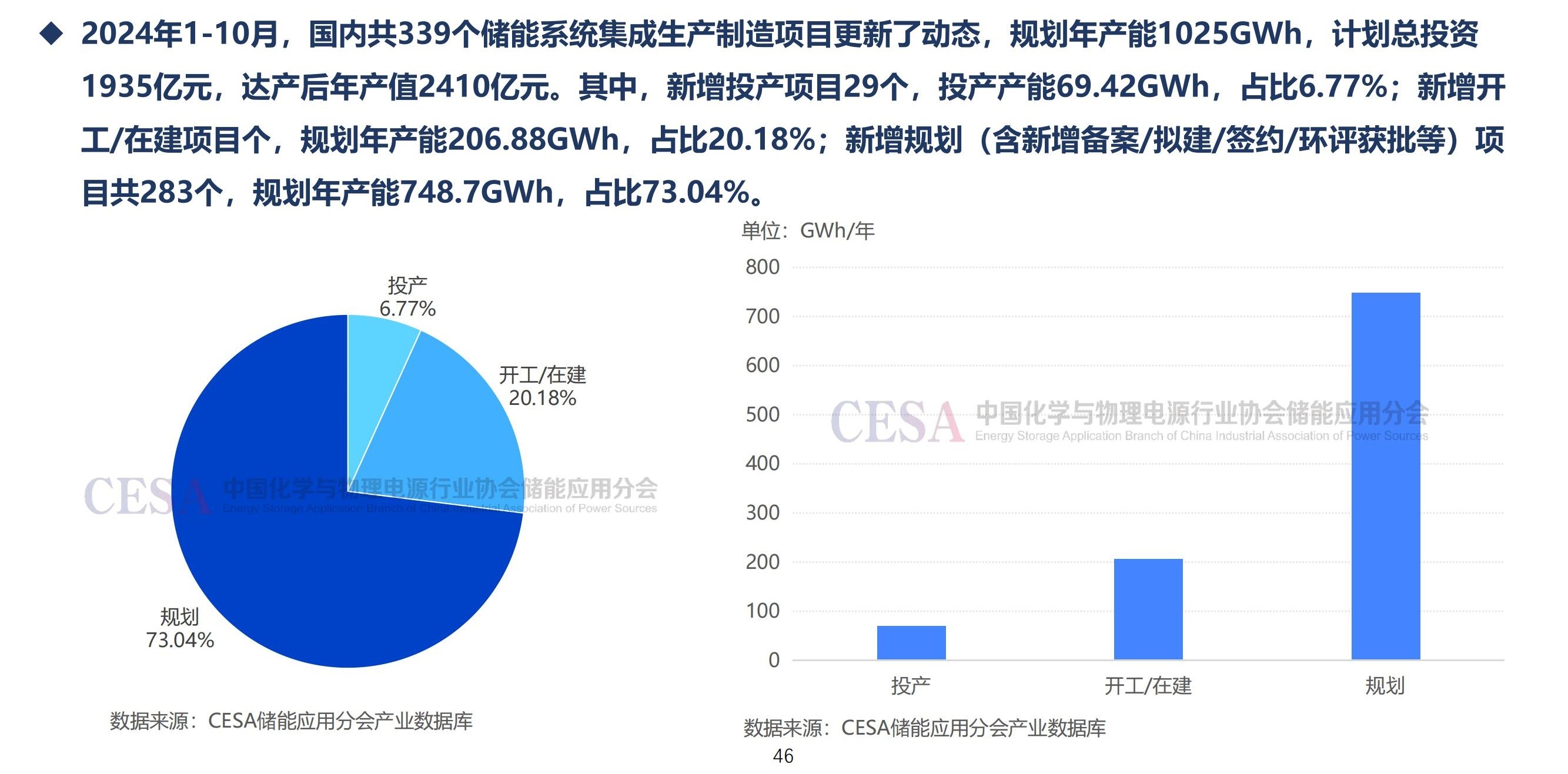另外,前10月,339個(gè)儲(chǔ)能系統(tǒng)集成擴(kuò)產(chǎn)項(xiàng)目中,新增投產(chǎn)項(xiàng)目29個(gè),投產(chǎn)產(chǎn)能69.42GWh,占比6.77%;新增開(kāi)工/在建項(xiàng)目個(gè),規(guī)劃年產(chǎn)能206.88GWh,占比20.18%;新增規(guī)劃(含新增備案/擬建/簽約/環(huán)評(píng)獲批等)項(xiàng)目共283個(gè),規(guī)劃年產(chǎn)能748.7GWh,占比73.04%。