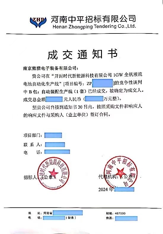 中國(guó)儲(chǔ)能網(wǎng)訊:近日,南京熊貓電子裝備有限公司成功中標(biāo)開(kāi)封時(shí)代1GW大電堆全釩液流電池自動(dòng)化生產(chǎn)線項(xiàng)目。此次成功中標(biāo),為熊貓裝備智能產(chǎn)線項(xiàng)目在儲(chǔ)能智能制造領(lǐng)域奠定了新的基礎(chǔ)。