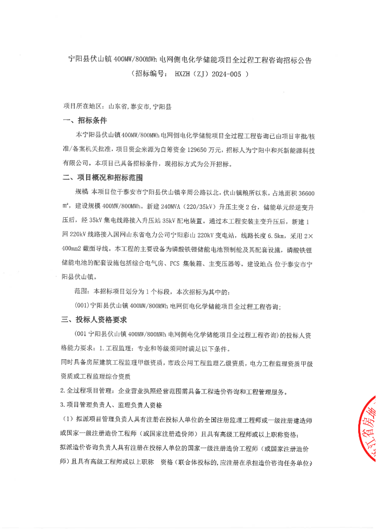 400MW/800MWh!山東省寧陽縣伏山鎮(zhèn)電網(wǎng)側(cè)電化學(xué)儲(chǔ)能項(xiàng)目全過程工程咨詢招標(biāo)公告