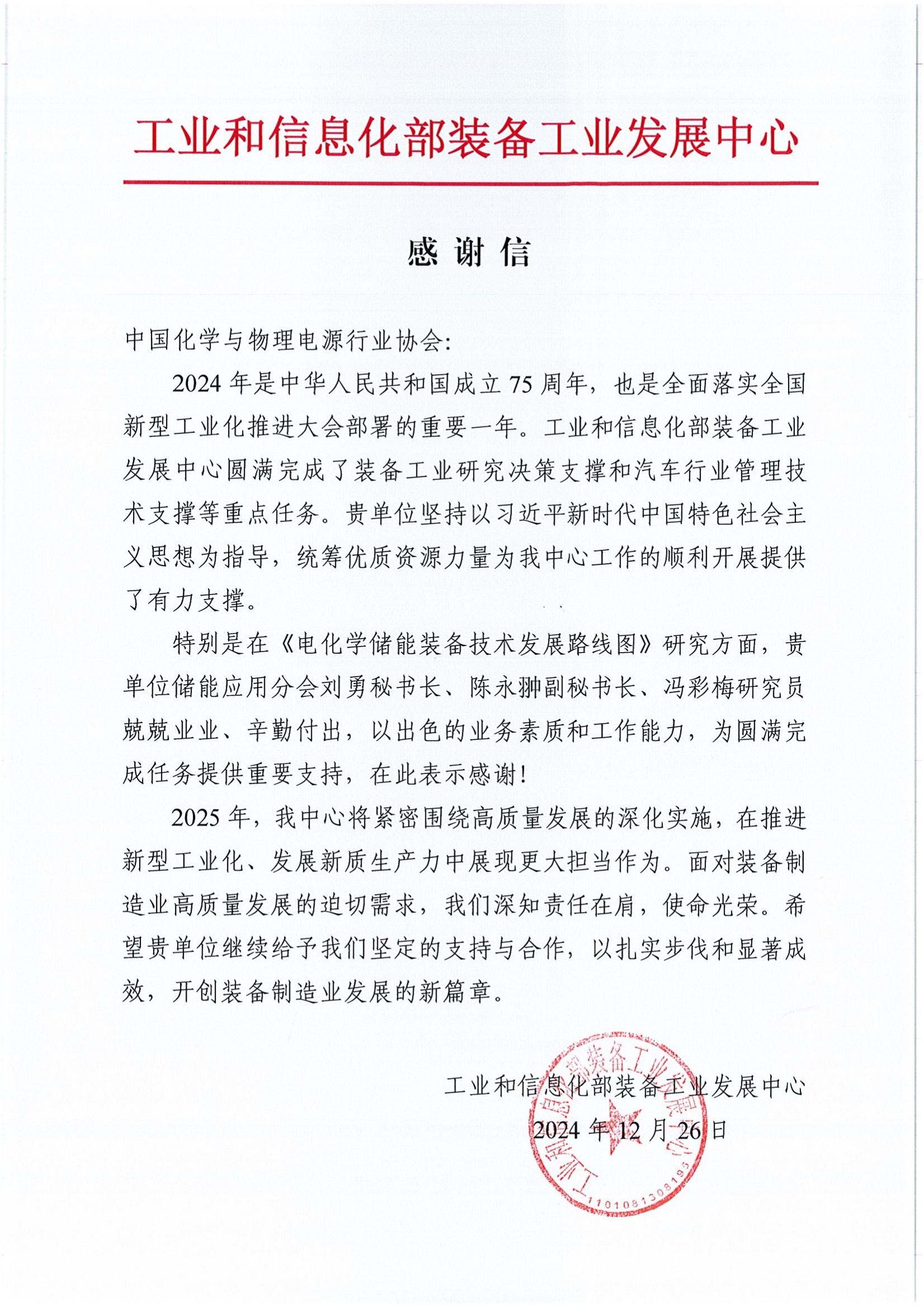 中國(guó)儲(chǔ)能網(wǎng)訊:12月26日,工業(yè)和信息化部裝備工業(yè)發(fā)展中心向中國(guó)化學(xué)與物理電源行業(yè)協(xié)會(huì)致感謝信。