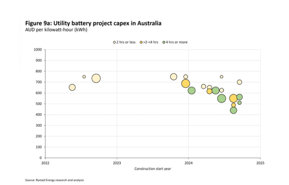Rystad Energy公司在報告指出,自從2023年8月以來,電池儲能項(xiàng)目資本支出在12個月內(nèi)下降了33%。2024年部署的電池儲能項(xiàng)目資本支出將在450澳元/kWh至600澳元/kWh之間,這與澳大利亞國家科學(xué)機(jī)構(gòu)估計的423澳元/kWh相符。
