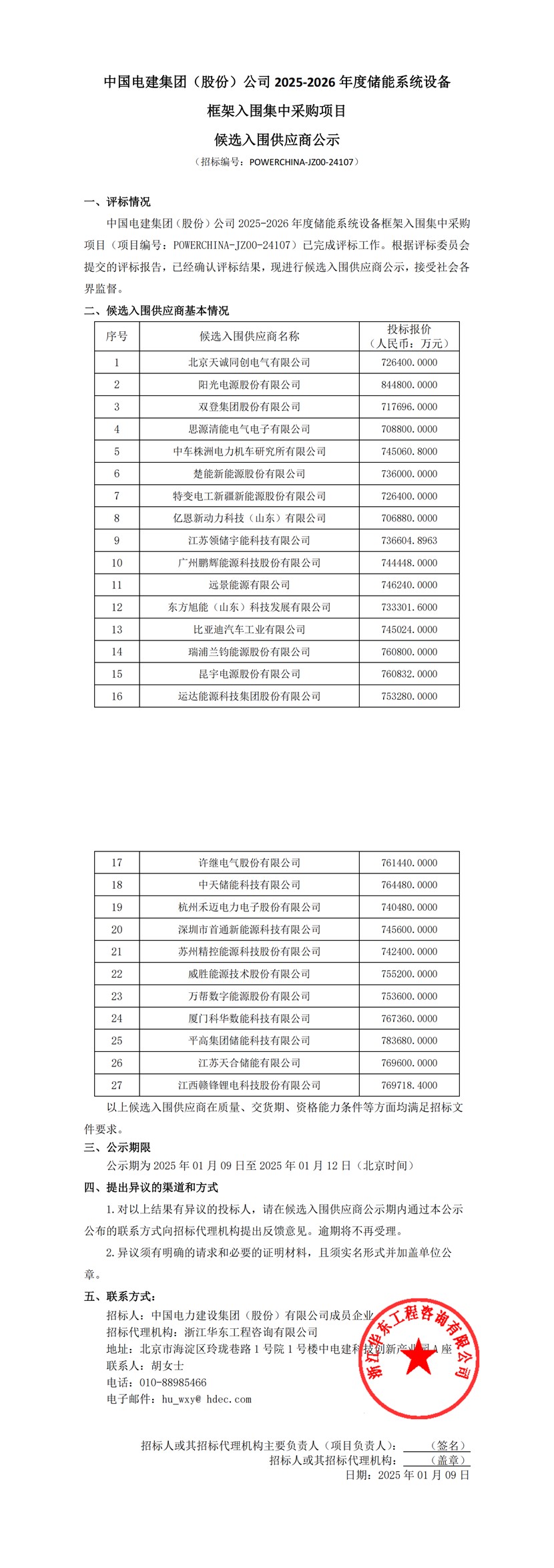 中國儲能網(wǎng)訊:1月9日,中國電建集團(股份)公司2025-2026年度儲能系統(tǒng)設(shè)備框架入圍集中采購項目候選入圍供應(yīng)商公示。