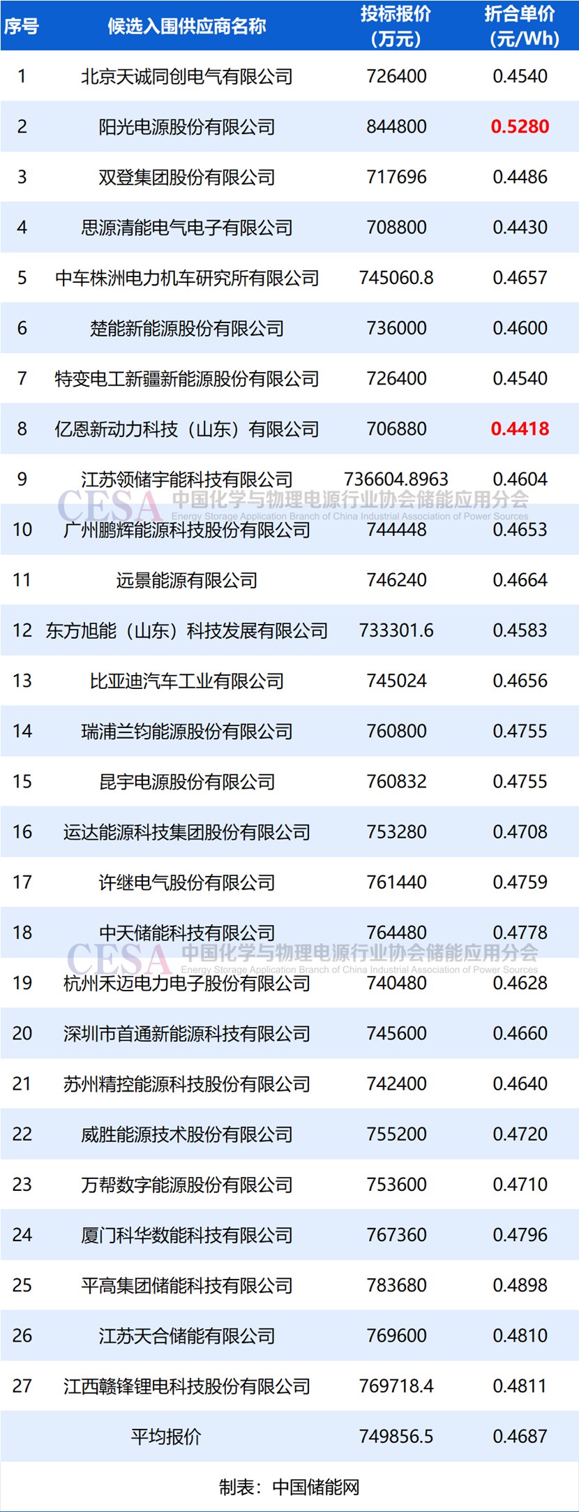 入圍的這27家企業(yè)投標(biāo)報價范圍在0.4418-0.528元/Wh,平均單價0.4687元/Wh。最低報價來自于億恩新動力,其報價為70.688億元,折合單價0.4418元/Wh,最高報價來自于陽光電源84.48億元,折合單價0.528元/Wh,也是入圍企業(yè)中唯一超過0.5元/Wh的企業(yè)。
