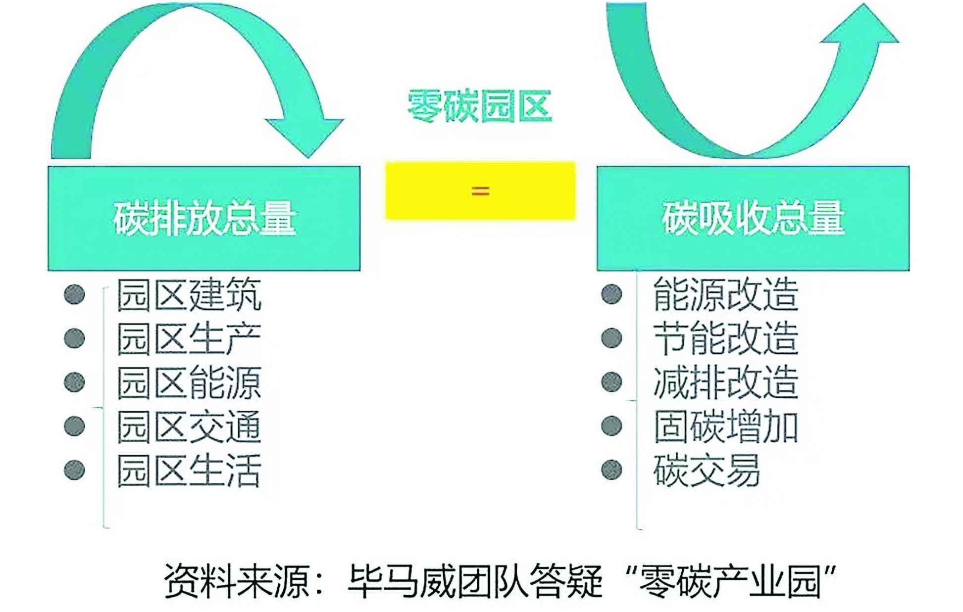 雖然零碳園區(qū)的地位如此重要,但到底什么是“零碳園區(qū)”,目前業(yè)界還未統(tǒng)一說法。中國投資協(xié)會發(fā)布的《零碳園區(qū)評價標(biāo)準(zhǔn)》中指出,零碳園區(qū)主要是綜合利用節(jié)能、減排、固碳、碳匯、碳交易、可再生能源等多種手段,使得評價期內(nèi)園區(qū)內(nèi)部基本實現(xiàn)碳排放總量與吸收自我平衡,能源資源高效利用、產(chǎn)業(yè)功能布局合理、運行管理智能高效的園區(qū)。