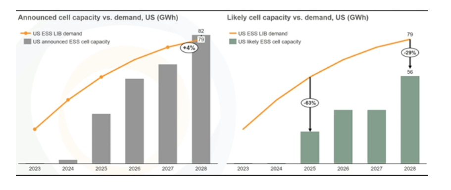 圖1美國2023年到2028年的電池產(chǎn)量與市場需求(GWh)