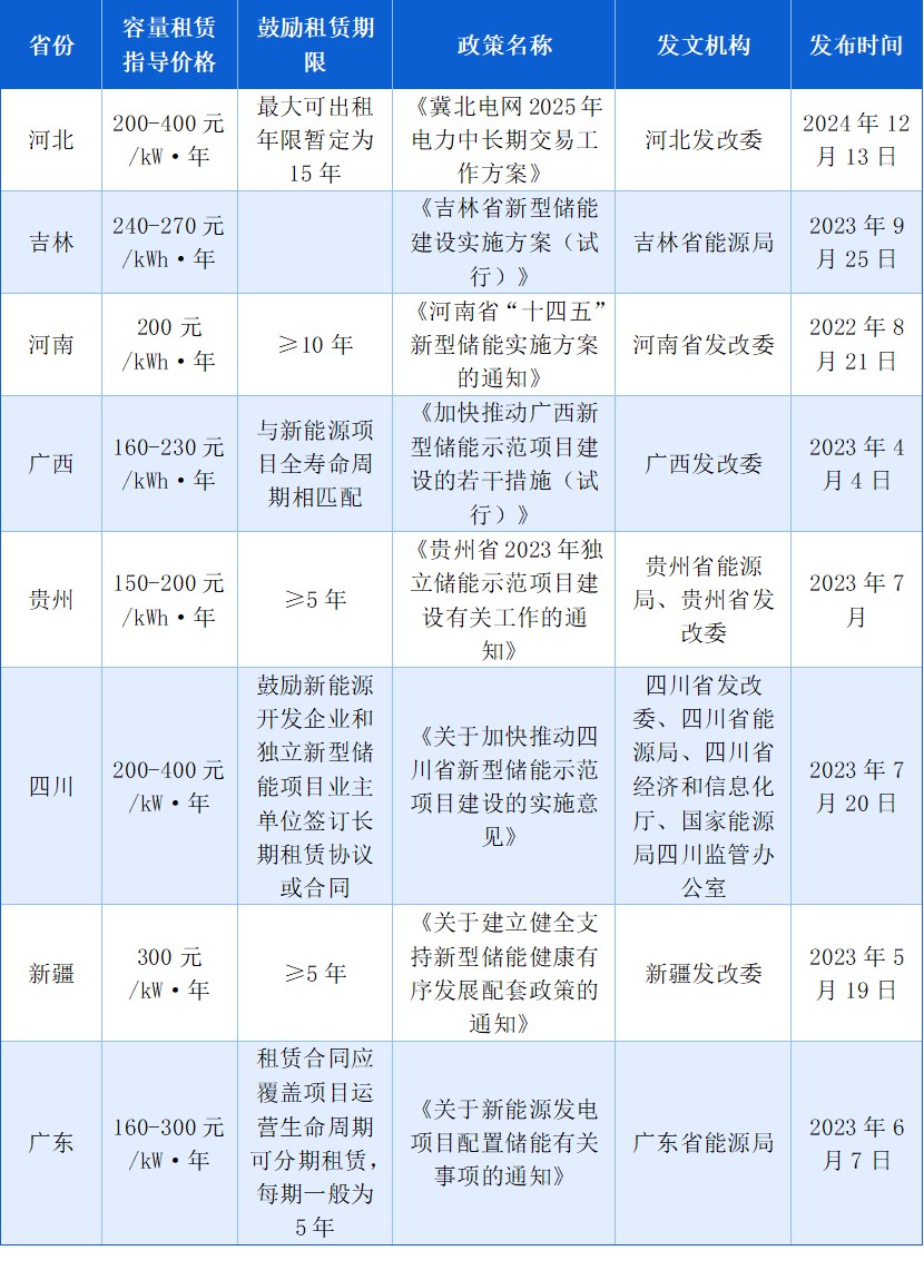 2024年8月,河北省發(fā)改委發(fā)布的《關(guān)于促進獨立儲能加快發(fā)展有關(guān)事項的通知》明確提出,自2024年9月30日起,未開工新能源項目需配建儲能的,鼓勵優(yōu)先通過租賃方式配置儲能,不再單獨配建容量低于10萬千瓦/20萬千瓦時的儲能設(shè)施。獨立儲能可在同一省級電網(wǎng)區(qū)域向新能源項目出租容量,不受市域限制。12月,河北發(fā)改委發(fā)布《冀北電網(wǎng)2025年電力中長期交易工作方案》,其中明確,獨立儲能參與容量租賃交易,2025年交易價格上、下限暫定400、200元/千瓦·年。交易合同價格經(jīng)購售雙方協(xié)商一致后,每年可修改一次。
